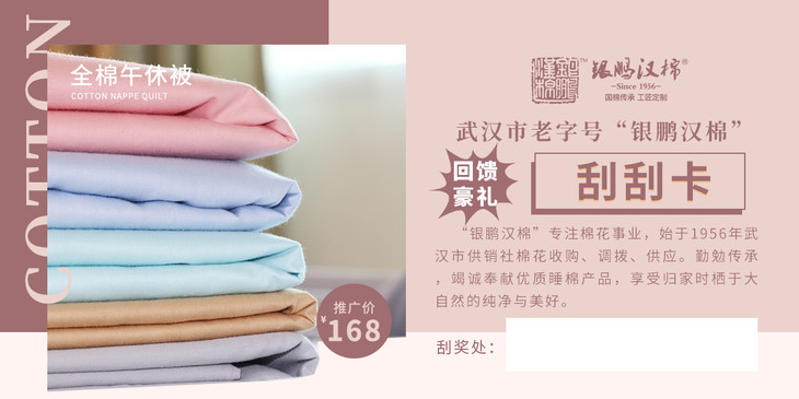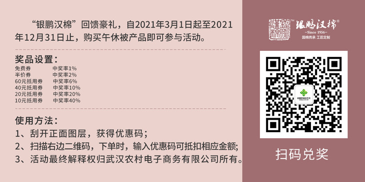 “银鹏汉棉”回馈豪礼,自2021年3月1日起至2021年12月31日止,购买银鹏汉棉午休被产品即可获得刮刮卡一张!