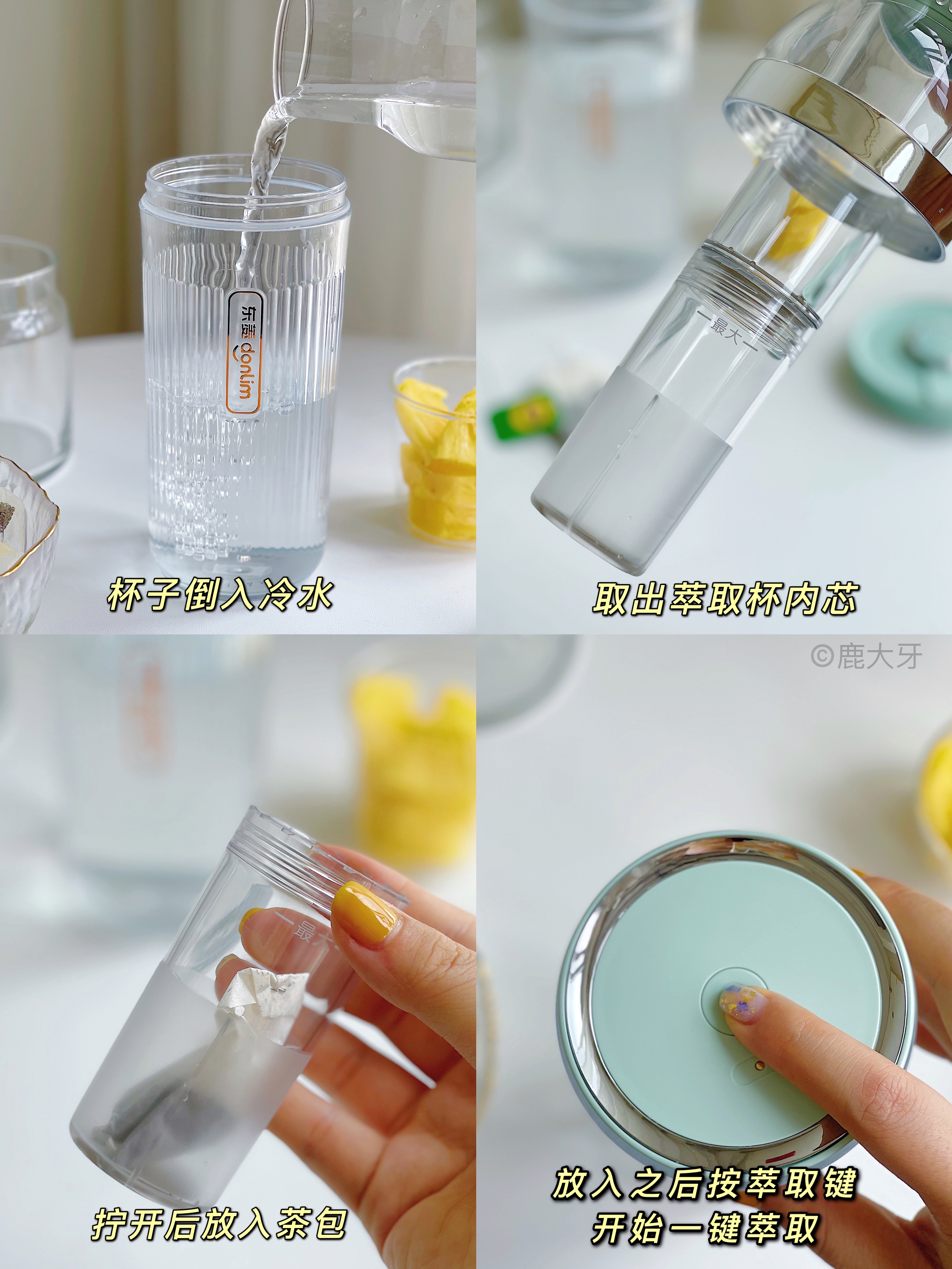 1. 东菱乐萃杯加入适量水,把茶包放入茶仓,按下按钮一键萃取冷萃茶汤;