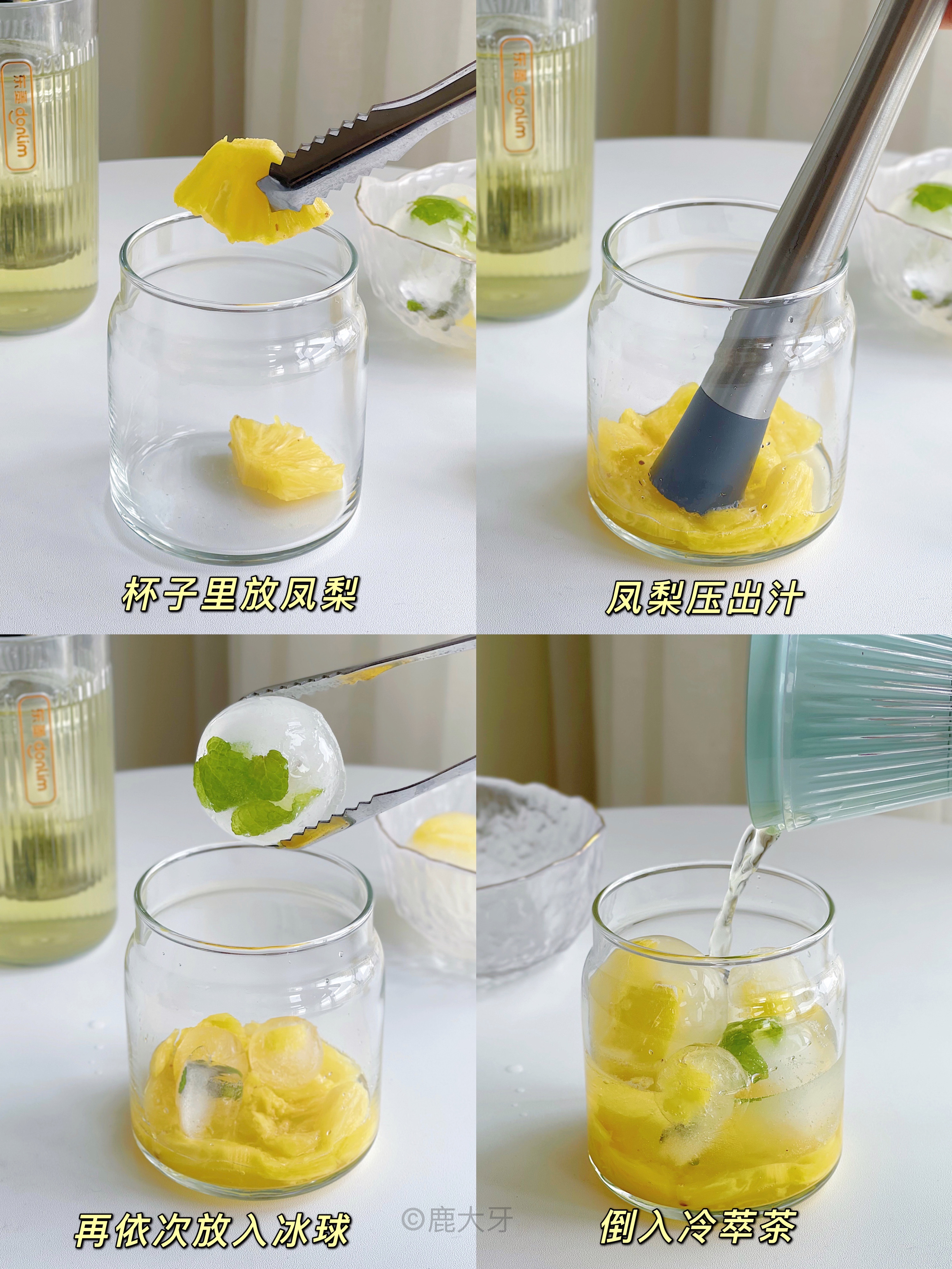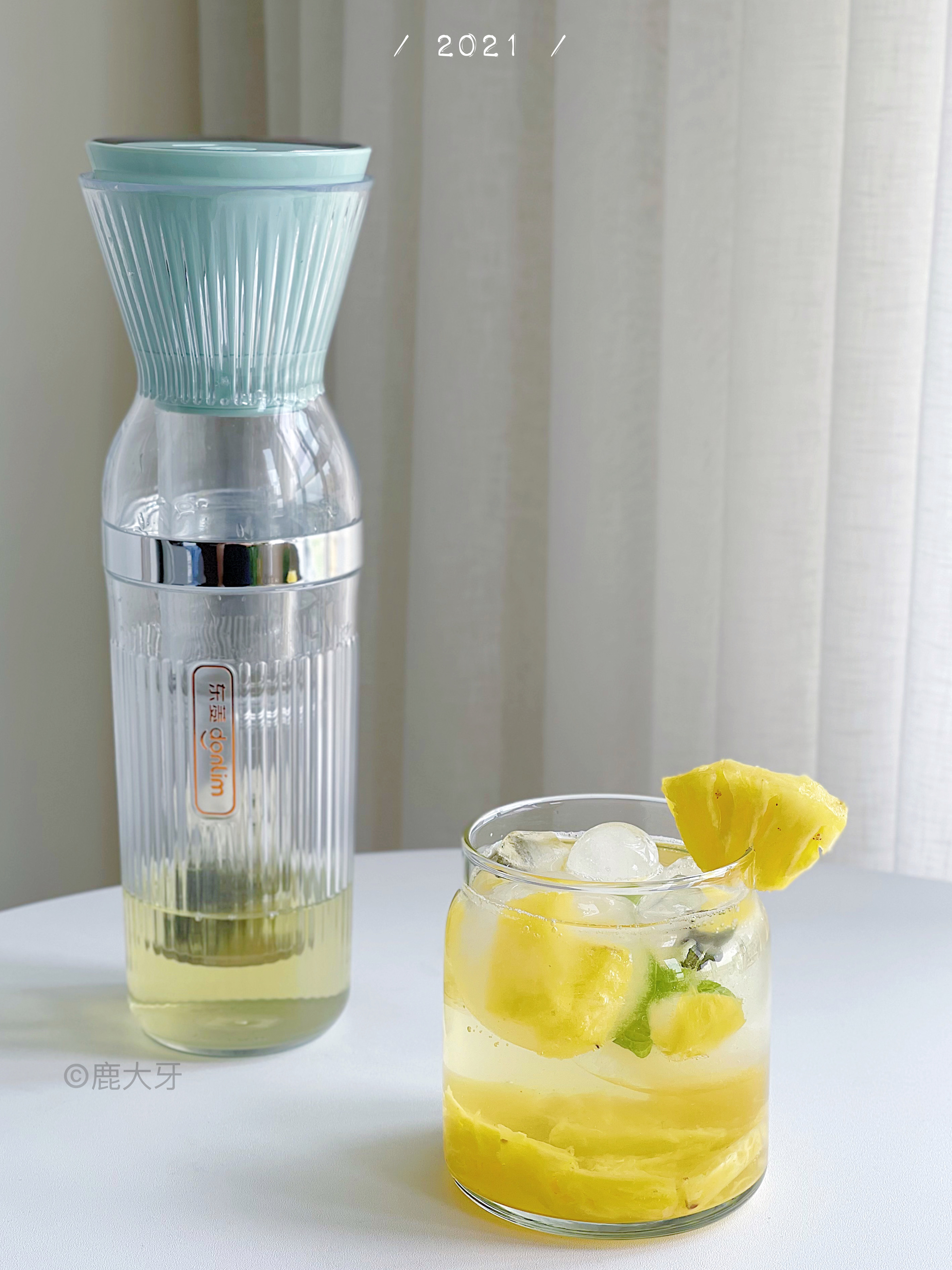 2.凤梨放入杯中压出凤梨汁,放入冰球;
