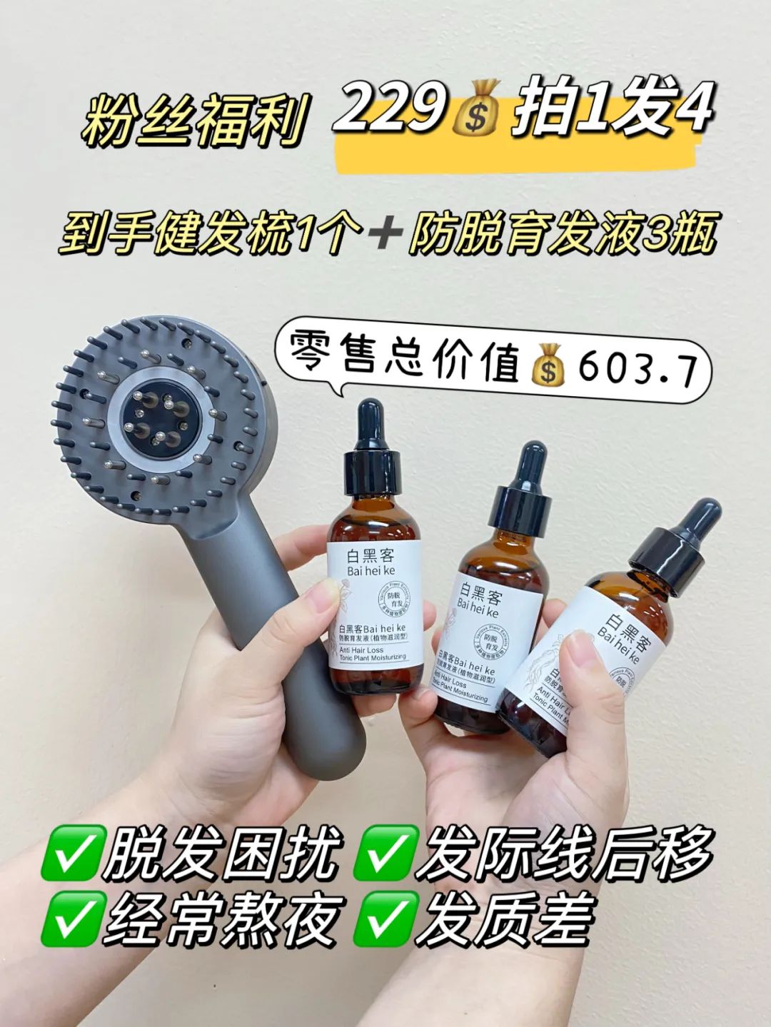 这款零售价499的健发梳,今日粉丝福利229,还送总价值104.7的特证育发液3瓶!相当于零售价的3.7折,真的划算!