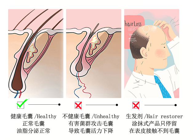 很多家人之用生发液、育发洗发水也没用,核心原因在于:毛囊萎缩、退化,无法吸收养分。所以想要发量多、脱发少,得从养护毛囊开始!