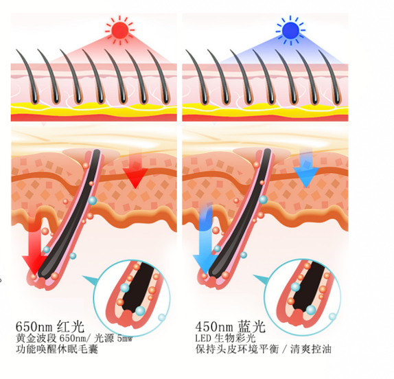 蓝光具有调节作用,可以帮助减少头皮上的油脂分泌,yi制细菌增长。