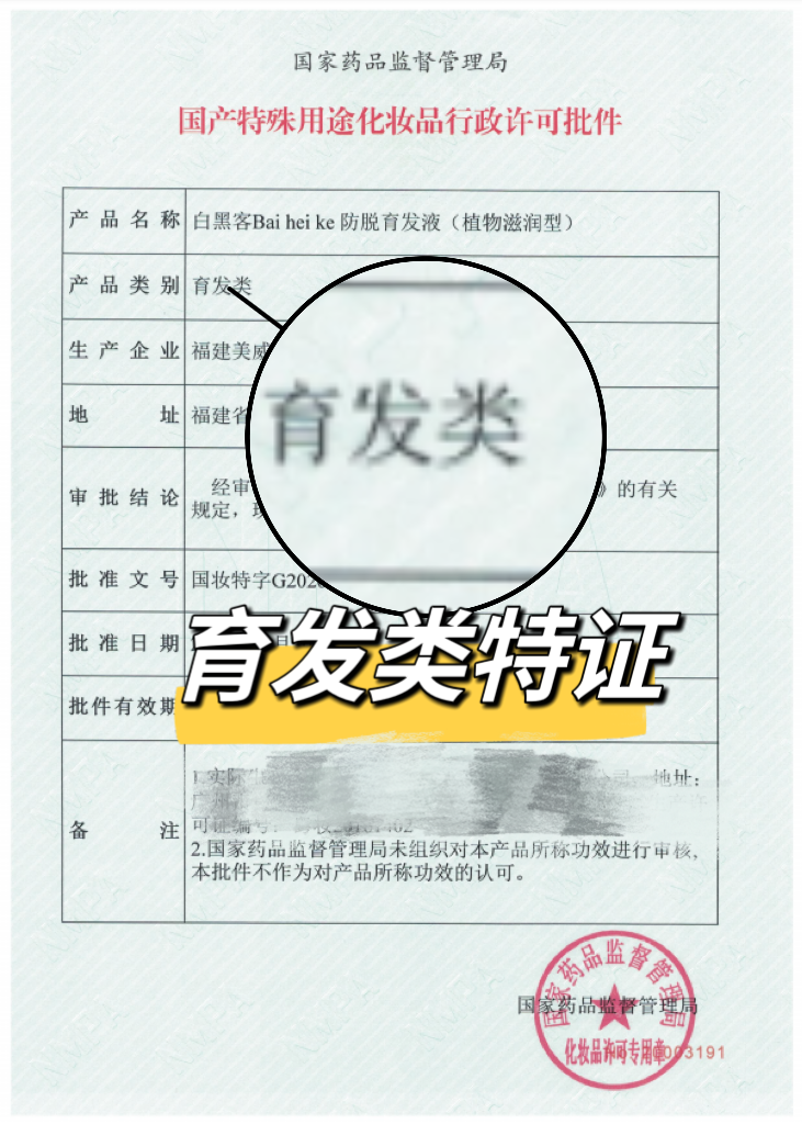 这个防脱育发液不是说说而已,有【育发特化证】,货真价实的持证上岗,效果有保障。