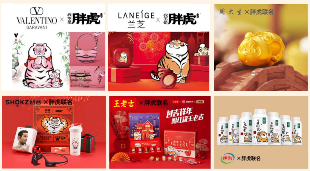 虎年的来临你会发现到处都是胖虎身影,不仅卖萌还实力圈粉,与国际一线大牌华伦天奴、兰芝、汤臣倍健、宝洁、草莓音乐节等多领域的品牌合作,推出了一系列的 IP 联名再次活跃在互联网上。