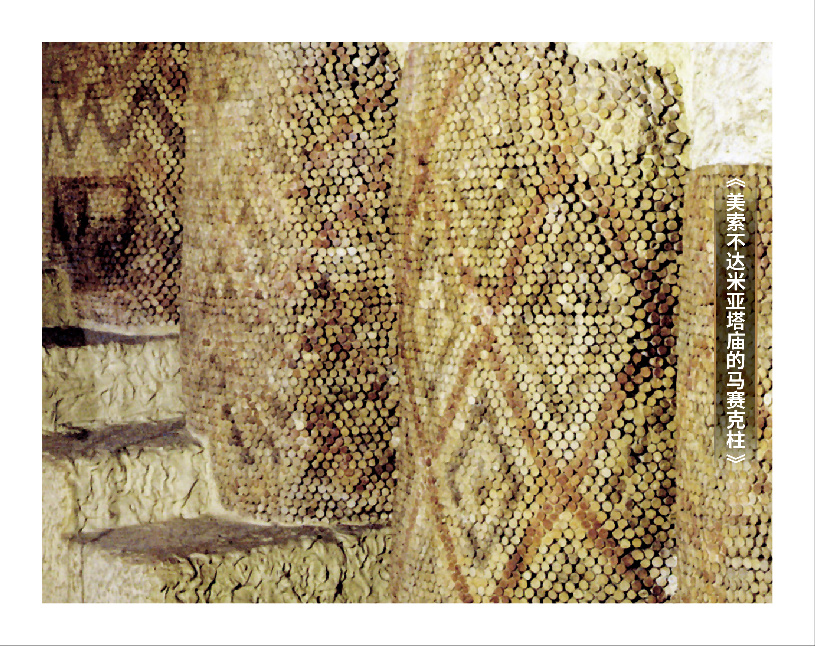 公元前4000年的乌鲁克塔庙的马塞克柱是人类首次运用马赛克装饰艺术。在西方文明与艺术的太阳一再升起的两河流域,人们用粘土制造成的钉子来装饰建筑的外墙,钉子上面有大理石,页岩和石灰岩拼成的图案,这些土钉被晒硬、涂上颜色后打入泥土中,拼成不同的几何图形。几十万个土钉在建筑物表面构成“之”字形、菱形和“人”字形。
