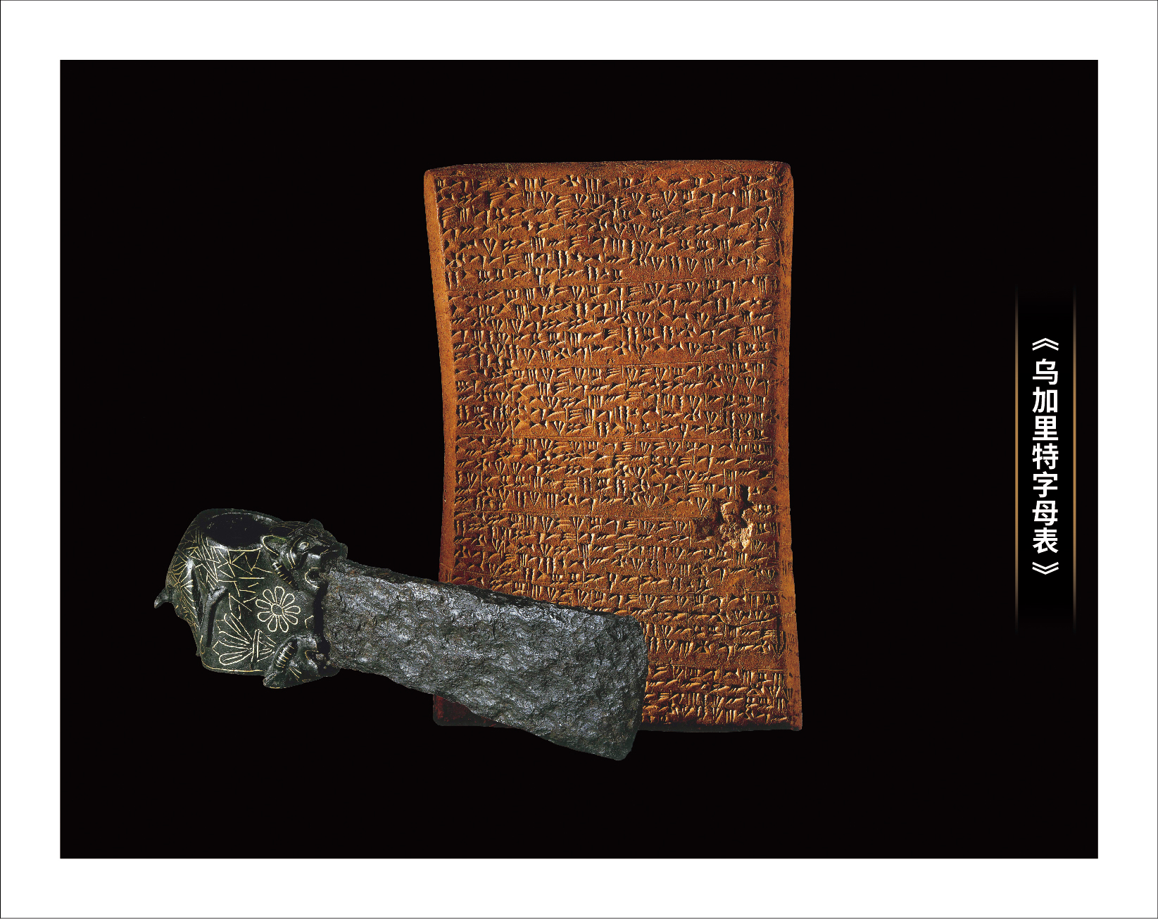 人类字母的首次书写—乌加里特字母表,现收藏于大马士革国家博物馆。楔形文字是古代两河流域的一种独特的文字,是人们用制成的三角尖头的芦苇杆、木棒或骨棒当“笔”,在软泥板上写成“楔形”的文字。这种文字起源于象形文字。是世界上所知最早的书写文字。乌加里特的书记员在公元前1400年创立了乌加里特字母表。