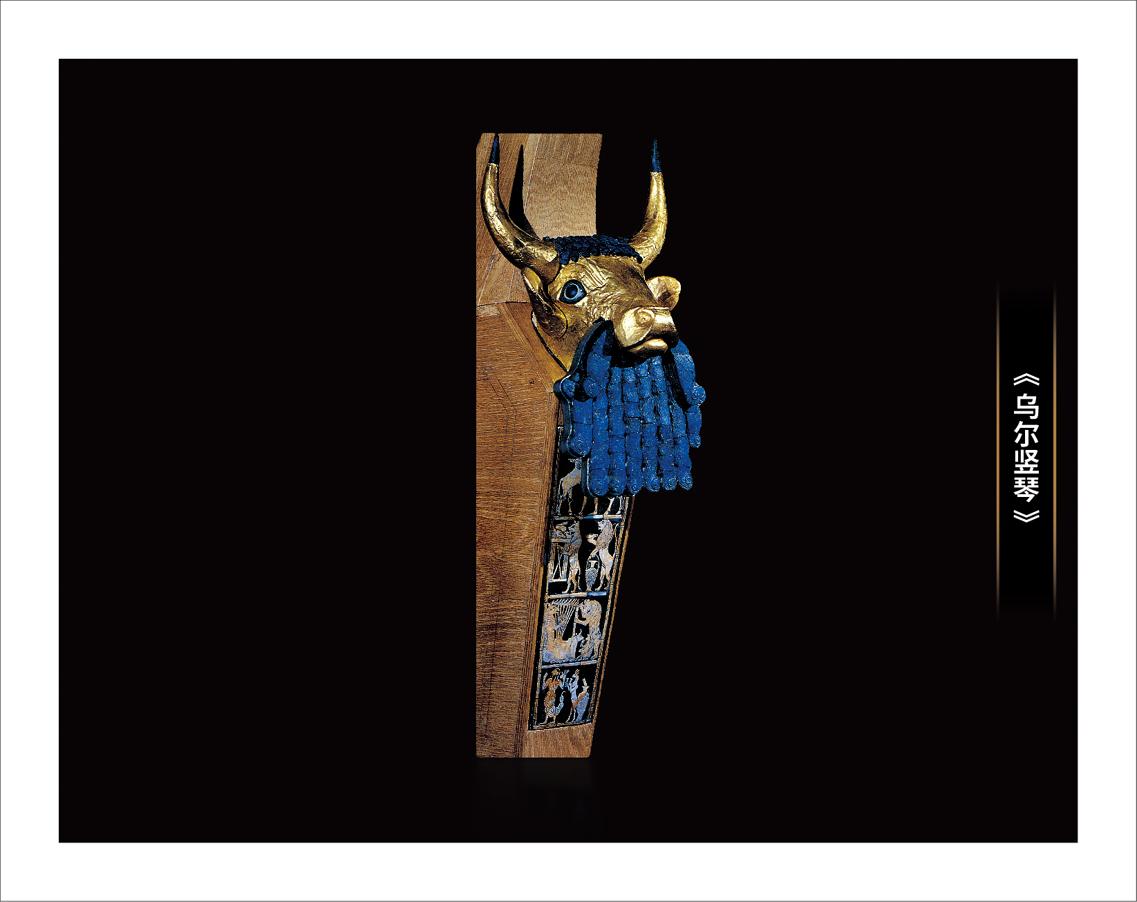 公元前3500年,苏美尔人的牛头竖琴是人类最古老的精美乐器。琴架顶部以牛头作为装饰,琴身由黄杨木制成,正面在沥青上用贝壳镶嵌着人和动物,其下的镶板则非常精致的嵌入贝壳,以描绘出四幅画像,其清晰的轮廓令人对其模糊隐晦的意义更感兴趣。这些画作既复杂又天真,很难说这些拟人化的动物原意为何,是具有严肃意义,还是神话或寓言的插图。他们有如魅惑人心的童话诗,让听者不得不相信。