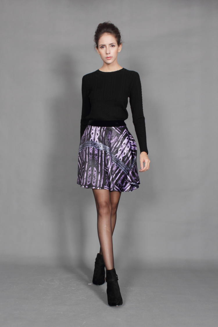 源自3500年前乌尔竖琴古贝紫,足以衬托你的高贵典雅。织花锦绸,精编分割,品质无可挑剔。花色绚丽,你的高雅无人可及。高腰修身,你的婀娜身段不须掩藏。