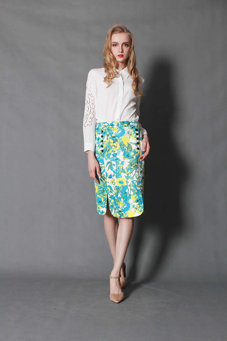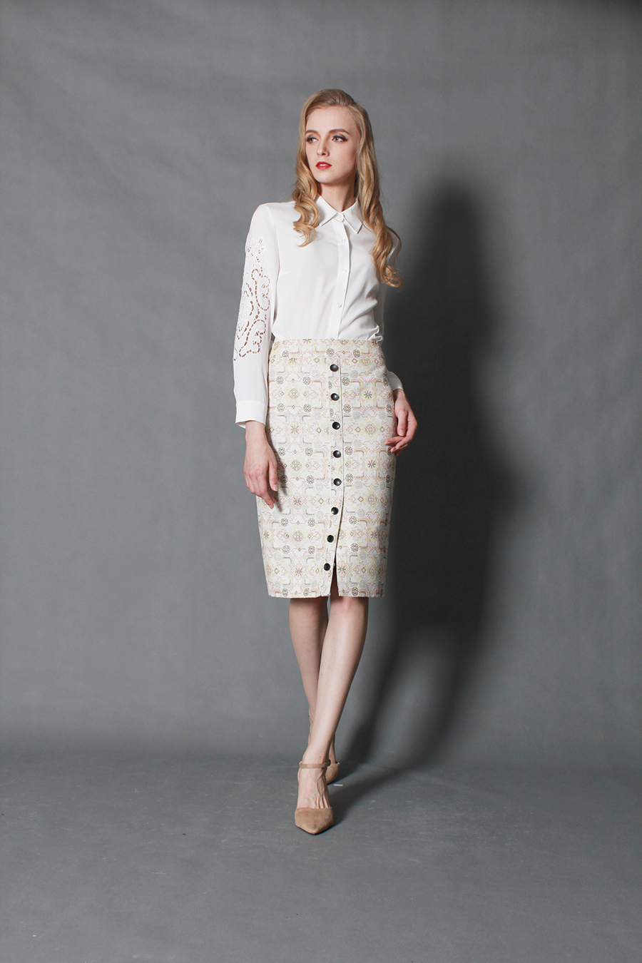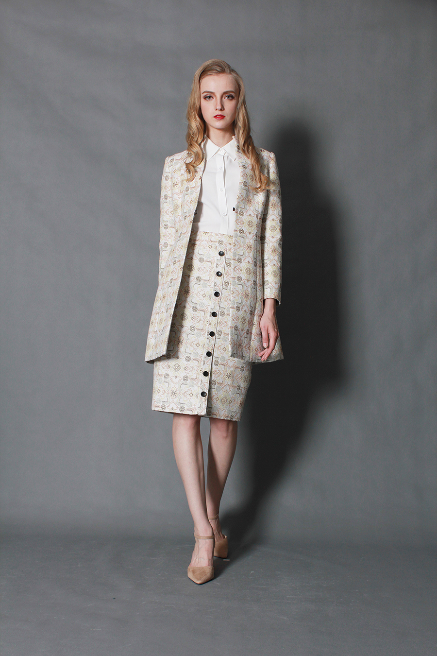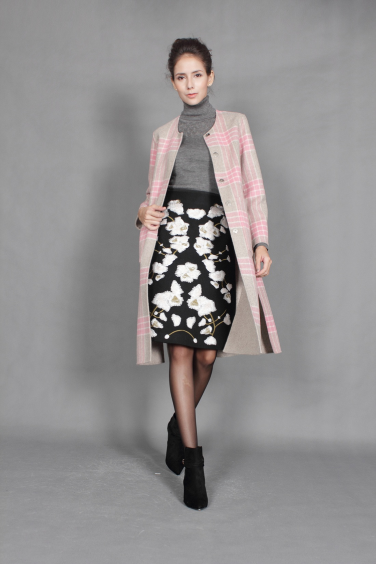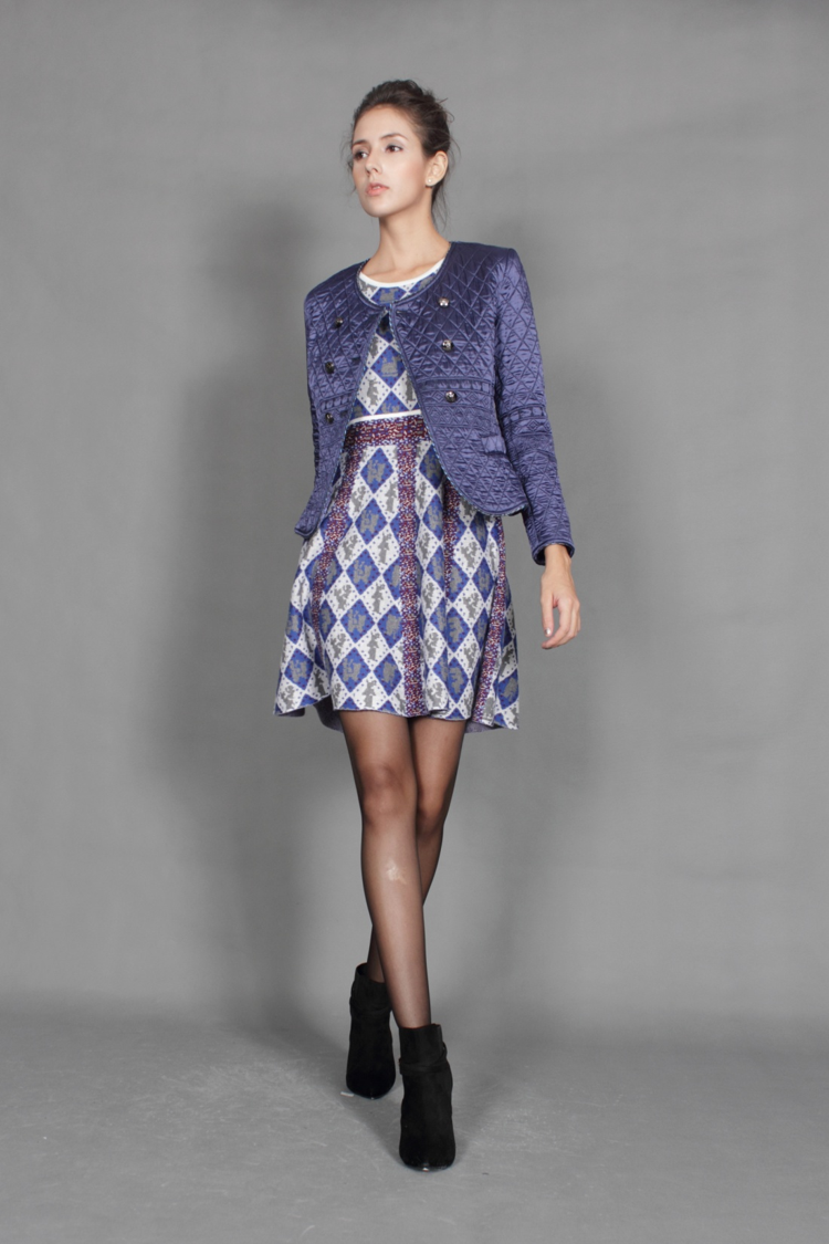 运用公元前3000年人类首例马赛克建筑艺术与几何纹理,结合现代工艺技术,让你对艺术的领略更胜人一筹。两排小扣,显出你对精致的要求。腰间拼接,勾勒出你的美丽曲线。简约A摆,秀出你迷人修长的小腿。前中小叉,表明你对时尚的态度。