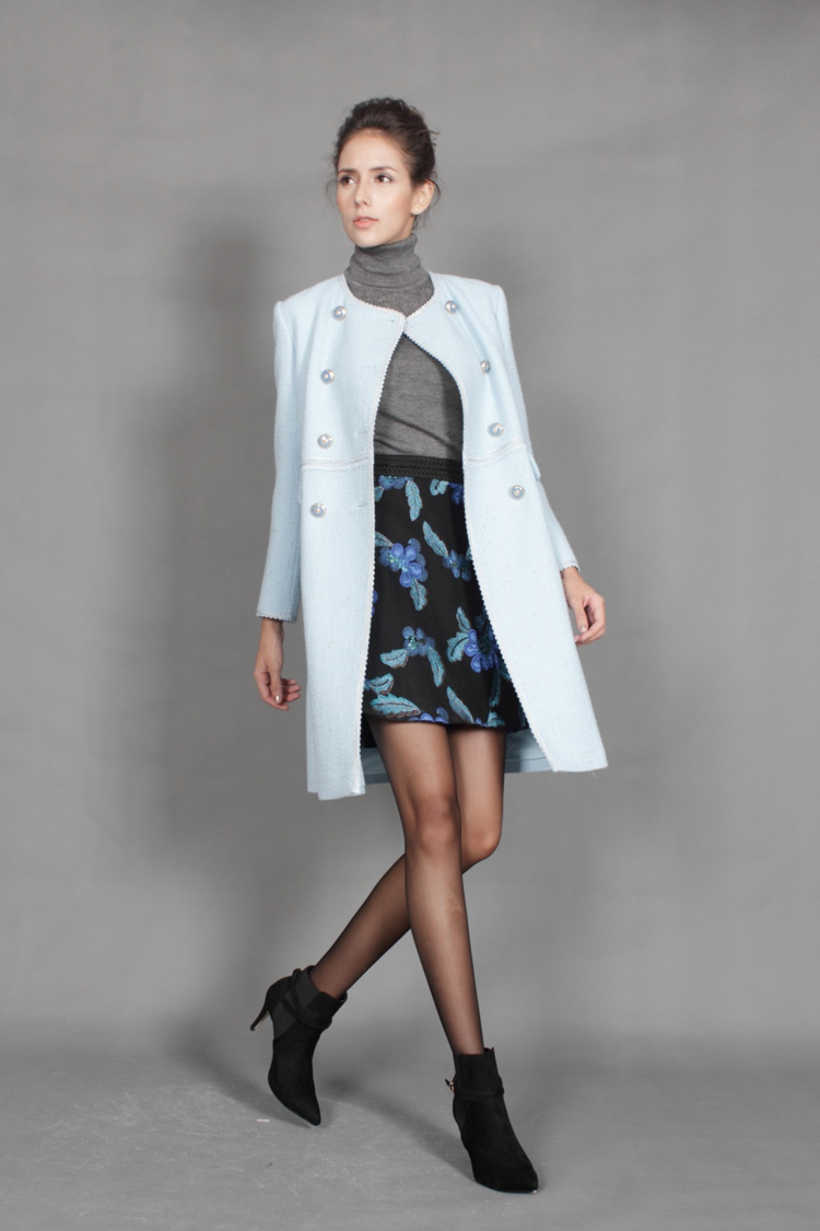 天空蓝,让你明快一秋,直筒廓形,通勤利落。双排扣点缀,精致时尚。颗粒提花呢,品质立显。