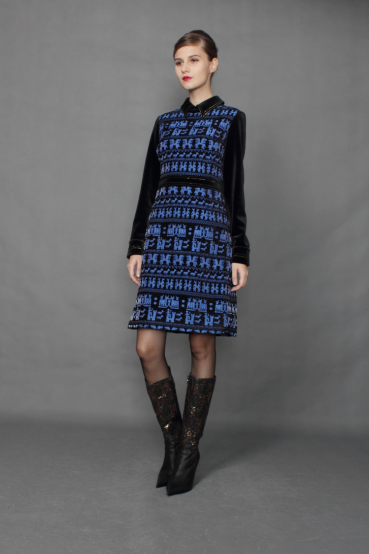 灵感来自4700年前乌尔王军旗,结合作品构图原理,通过丝绸光泽的印花工艺,艺术呈现欢庆愉悦的生活气息,显出你对艺术的钟爱。丝绸光泽,让您穿出大气华丽感。丝绒小立领,让你的高贵如此不经意。毛织拼袖,让你的双臂更加自由。