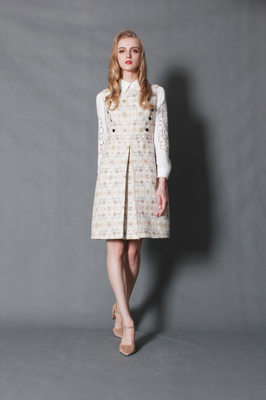 灵感源自公元前2000年,人类最早的印刷术——圆柱形封印,将那些远古活泼的场景,运用提花技术,惟妙惟肖的向你呈现出一场精彩绝伦的艺术盛宴。水溶绣花蕾丝,让你性感如此低调。A摆裙型,让你裙裾移摇,修身版型,彰显你婀娜身段。