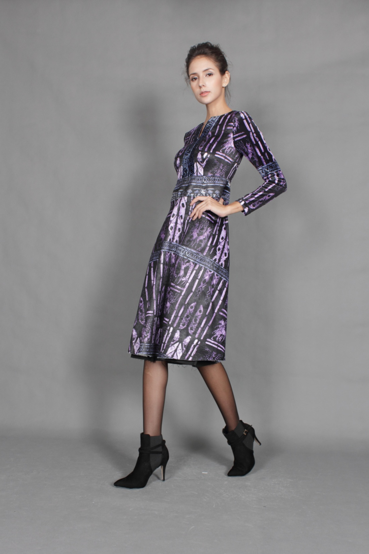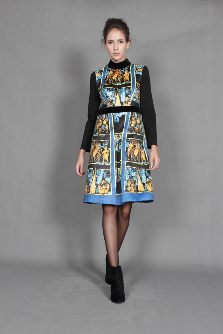 灵感源自于3500年前乌尔竖琴,作品绚丽的色彩对比度和既复杂又天真的图像,让你在感性的共鸣中自觉领略艺术之美。丝绸光泽,让您的雍容华丽无处可藏。收腰A摆廓型,让您妖娆多姿。精致的分割立剪,呈现艺术与时尚的浑然天成。