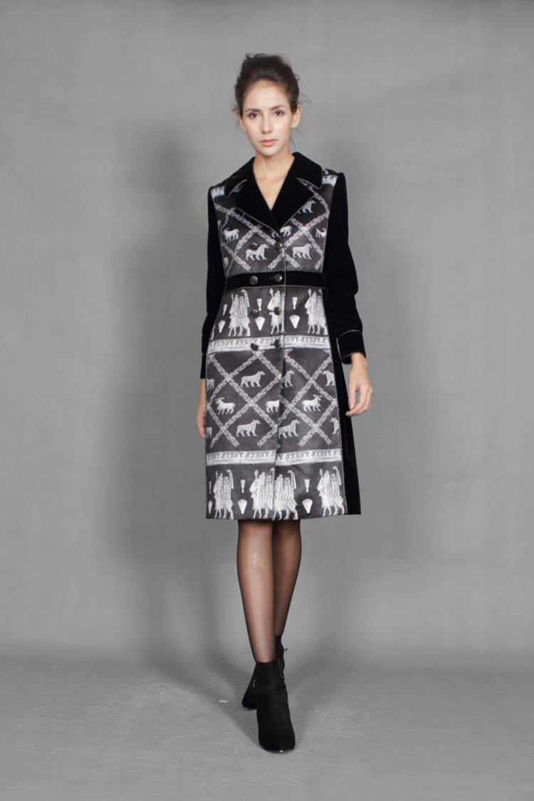 灵感来源于公元前5000年乌鲁克雪花石膏大瓶,表达一种时间万物循环,生生不息的意念,让你对艺术首次构图意念的理解快人一步。高定缎面织锦,满足你对品质的高要求。黑白经典,满足你在人群中低调的炫耀。修身腰结加双排扣,显示你对细节的不让步。长款A摆,让你女王般的气场无人可比。