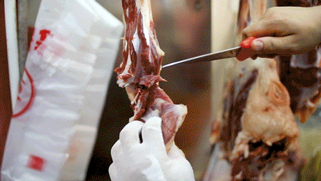 店里的羊肉串也是现切现烤的,羊肉串不用调味就上架烤制,他们家切的肉块挺大的,三瘦两肥,吃起来很过瘾。档口每天都会挂着2只羊,卖完就收摊。
