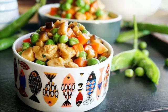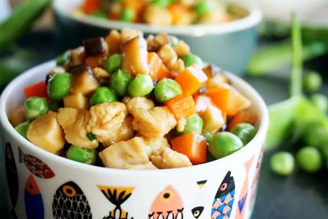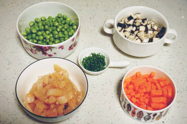 豌豆4两,鸡胸肉3两,胡萝卜半根,香菇5朵;