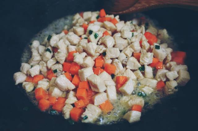 2、倒入1勺的料酒,鸡肉变色后放入香葱末,胡萝卜翻炒半分钟左右;