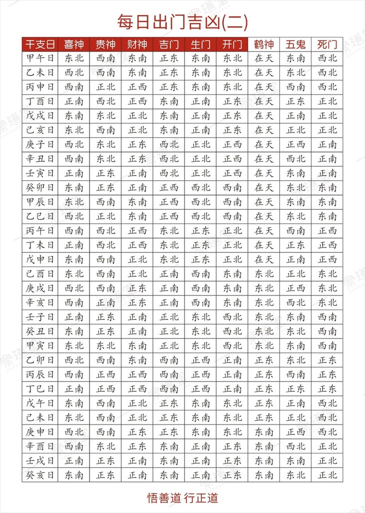 对照上面的表格,再看出门当日干支,就能一目了然查询喜神方、财神方、贵神方。