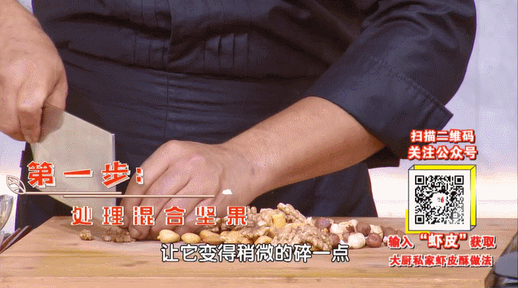 食材处理:将喜欢的坚果放在案板上切碎。用火先将紫菜烤一会让它干燥脱水,注意离火稍微远些;然后再将烤到酥掉渣的紫菜捏碎。