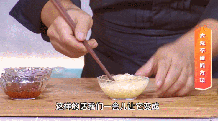 食材处理:大蒜捣成蒜泥,加入清水投洗。(目的:炸蒜的时候不会出现苦涩味道)