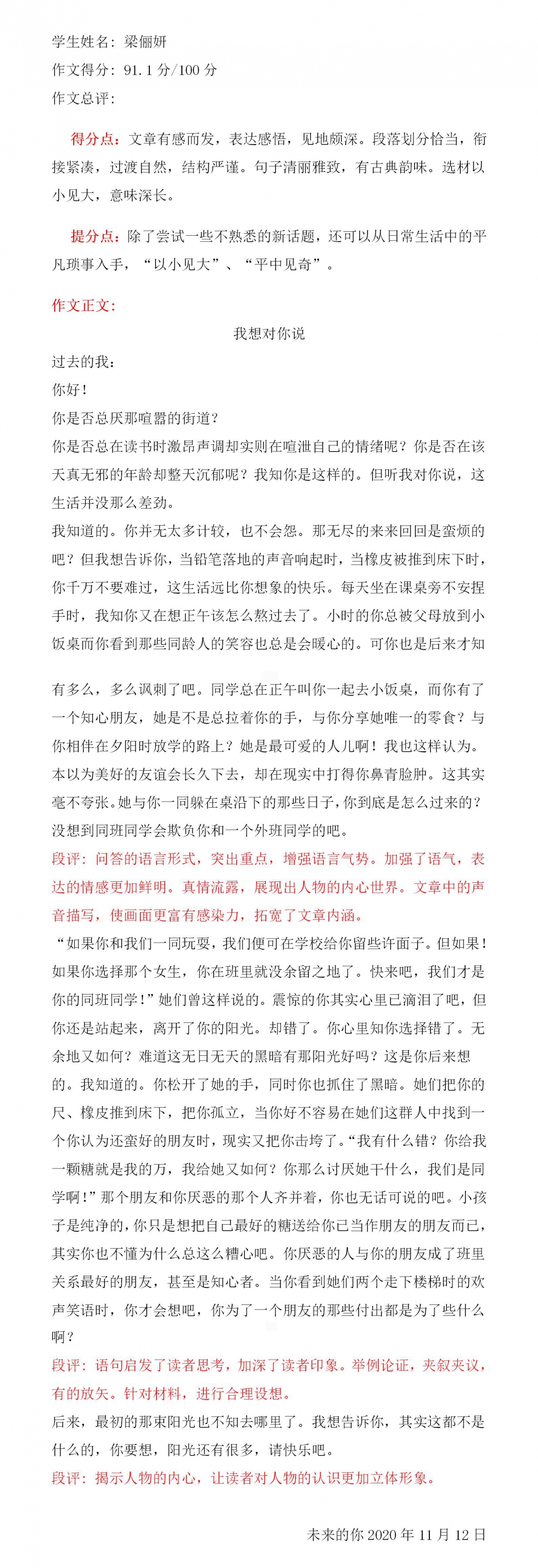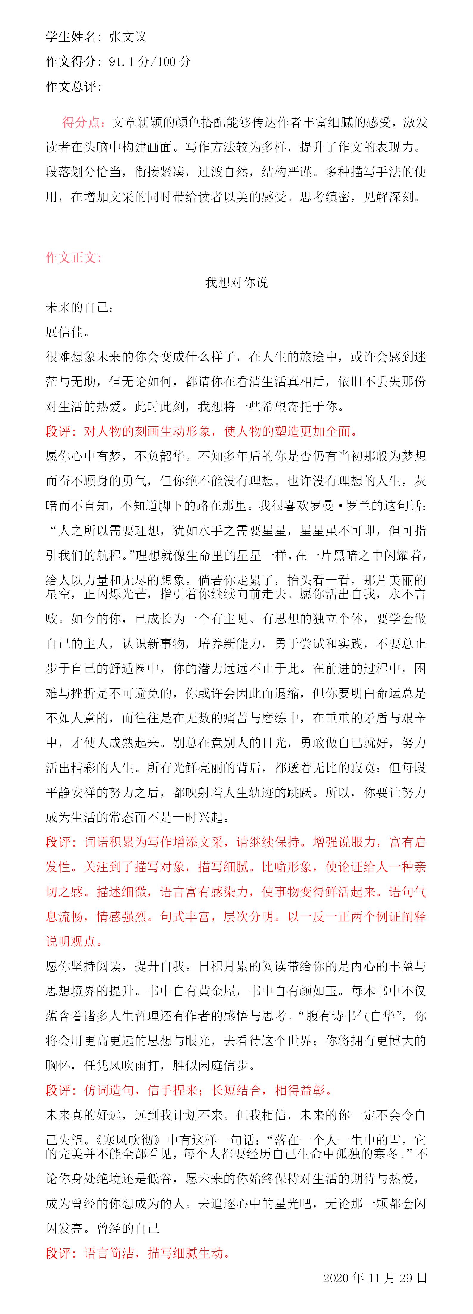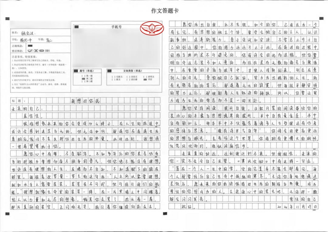 “未来”是一个看似很遥远的词语,我们无法预测未来,但这并不能阻止我们对未来的憧憬与向往。我认为把现在想说的话、想表达的情感以文字的方式传递给未来是一件很有意义的事。或许未来的我在读过这篇文章后会产生不同的思考与感悟,同时也希望这些文字能给予那时的我力量与信心。
