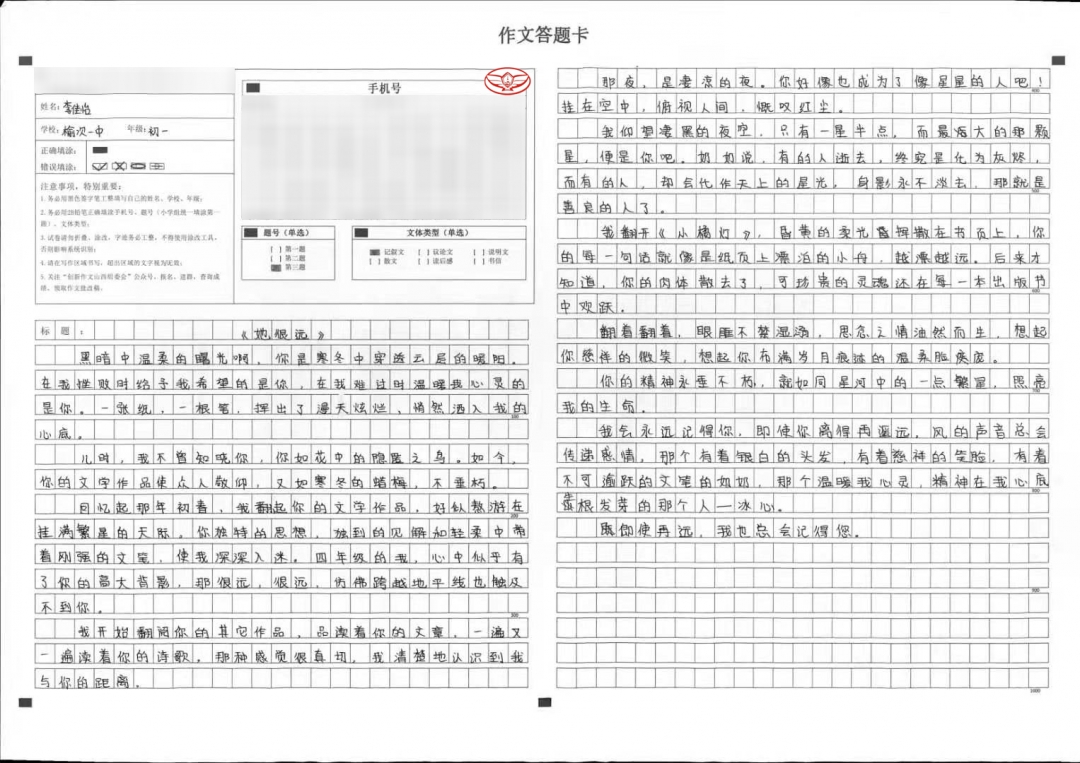 孩子从小就有一个当作家的梦想,作为家长更多的只是鼓励,技能方面只能靠孩子多看书,尽可能的带孩子去外面多走走,多看看。了解这个世界,读万卷书不如行万里路,从小学到初中,一直关注孩子的作文,孩子更多的是情感的流露表达,缺乏专业老师的指导,词语修辞手法的运用还欠火候,希望她能弥补不足,更上一层楼,朝着自己的目标奋发向前。爸爸妈妈相信你一定行,为你点赞!
