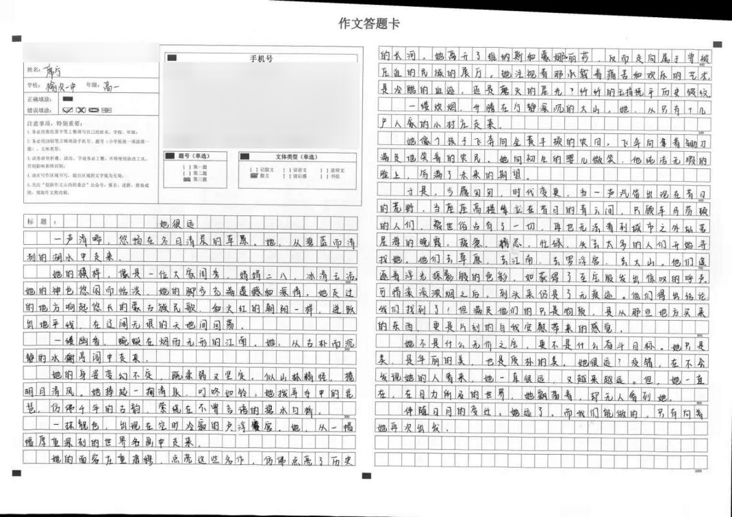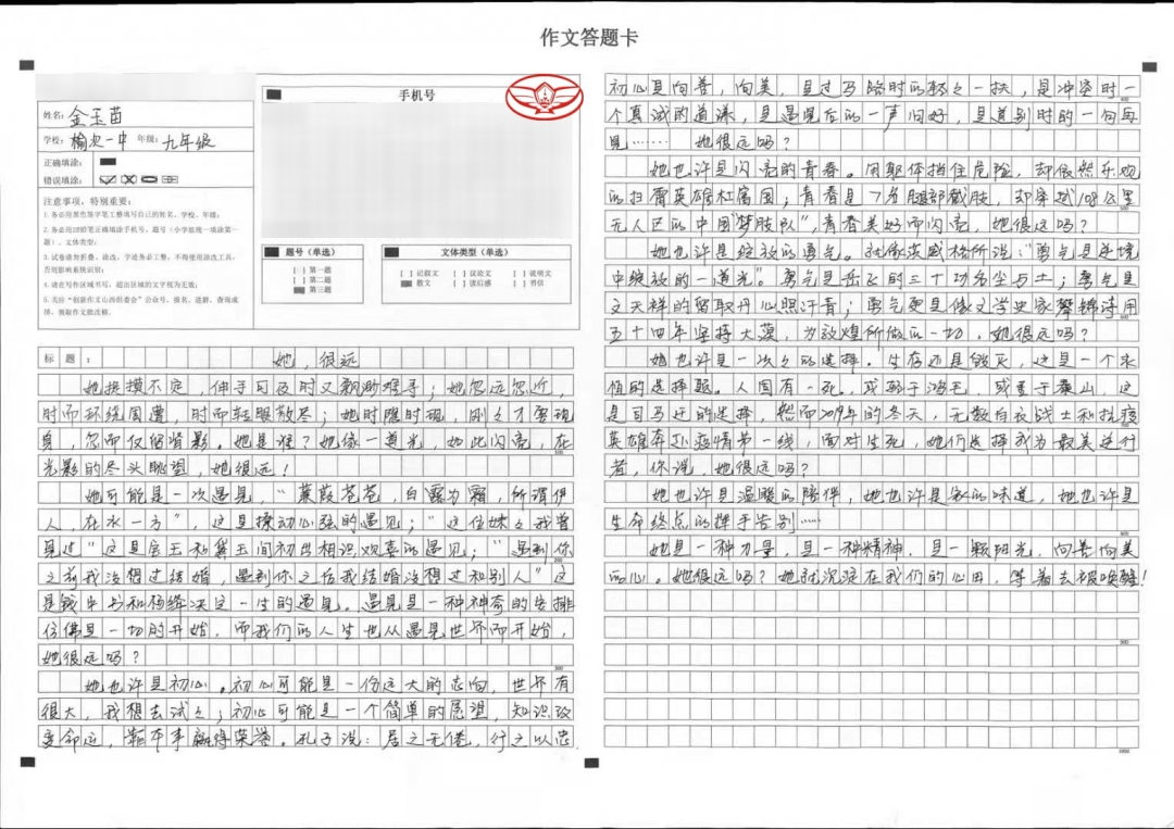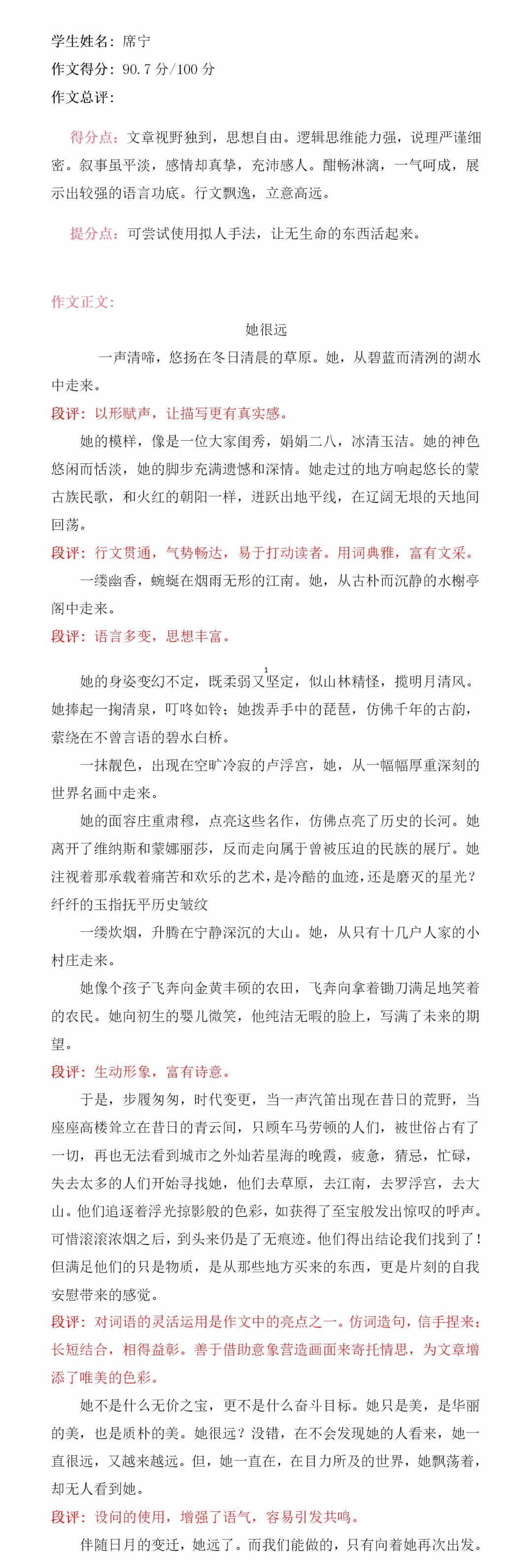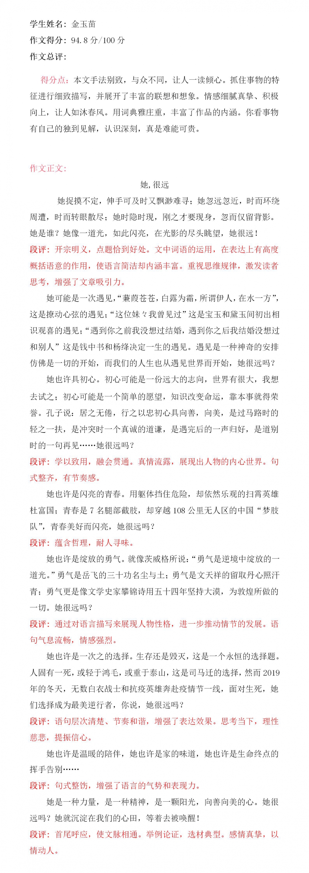 本学期我们刚学习了象征的写作手法,在我看到这次的作文题目时,我毫不犹豫地选择了《她很远》这个题目。因为,在我看来“她”不是具体的谁,她应该是一种经历,一种体验,一种人生的成长,因此,我把她根据人一生成长,从相遇、青春、勇气、拼搏以及对生活的态度,以意向的形象来表述她化身在我人生不同的阶段,与我同行,终究成熟为博大的爱来拥抱生活。