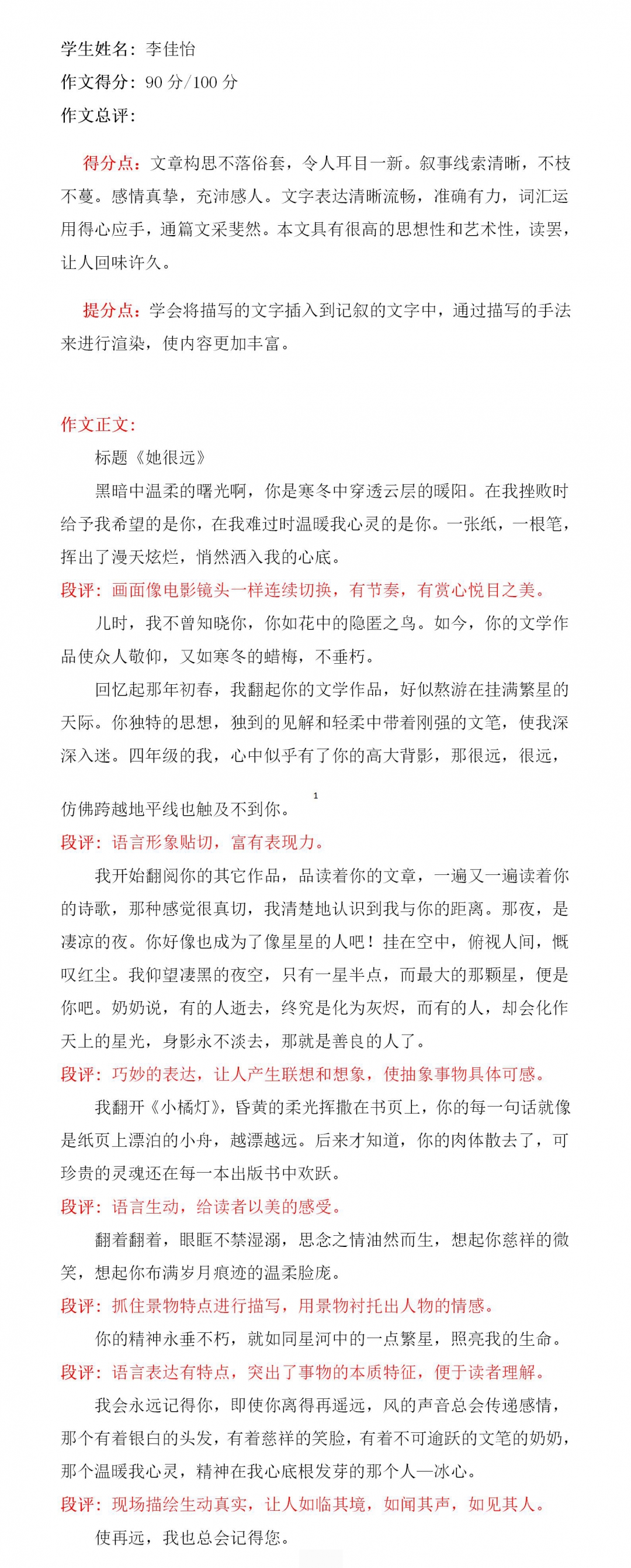 从这篇文章可以看出小作者从冰心先生那里感受到的不仅是知识的熏陶,更有语言文字的魅力。冰心先生是她心灵上的启蒙者,使她真正爱上了文字,爱上了文学,成为一个有情怀的人。小作者将她对冰心先生的仰慕、热爱之情,娓娓道来,内容真实,感情流露自然,毫不矫揉造作,语言朴实无华,通俗易懂,却又句句珠玑,意蕴深刻,体现了小作者一定的文学底蕴,整篇文章一气呵成,不失为一片佳作。