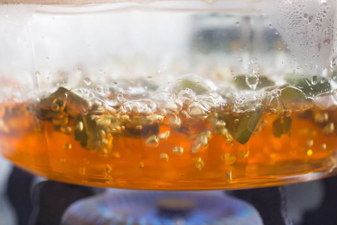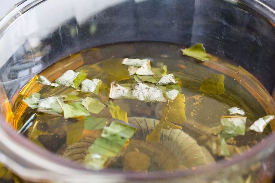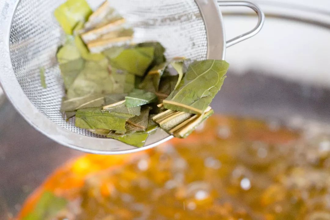 等时间差不多,汤色变成茶褐色后用漏勺把荷叶捞出。
