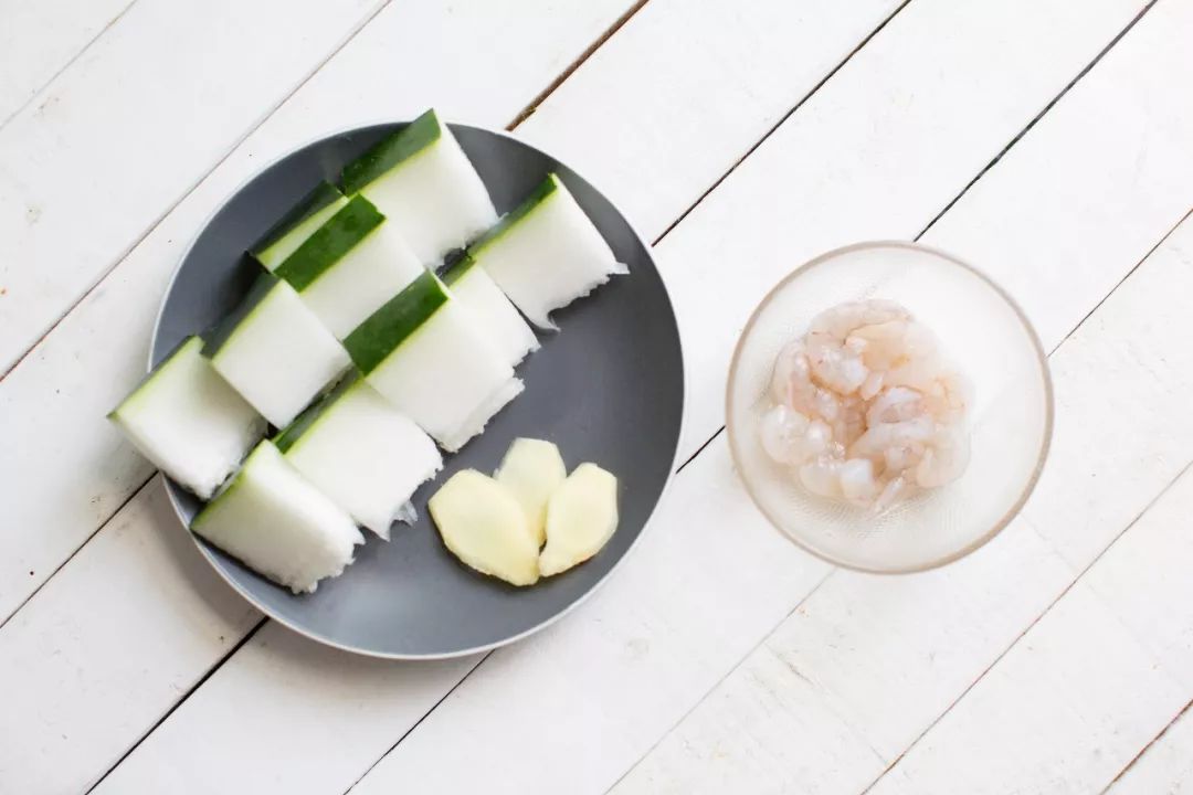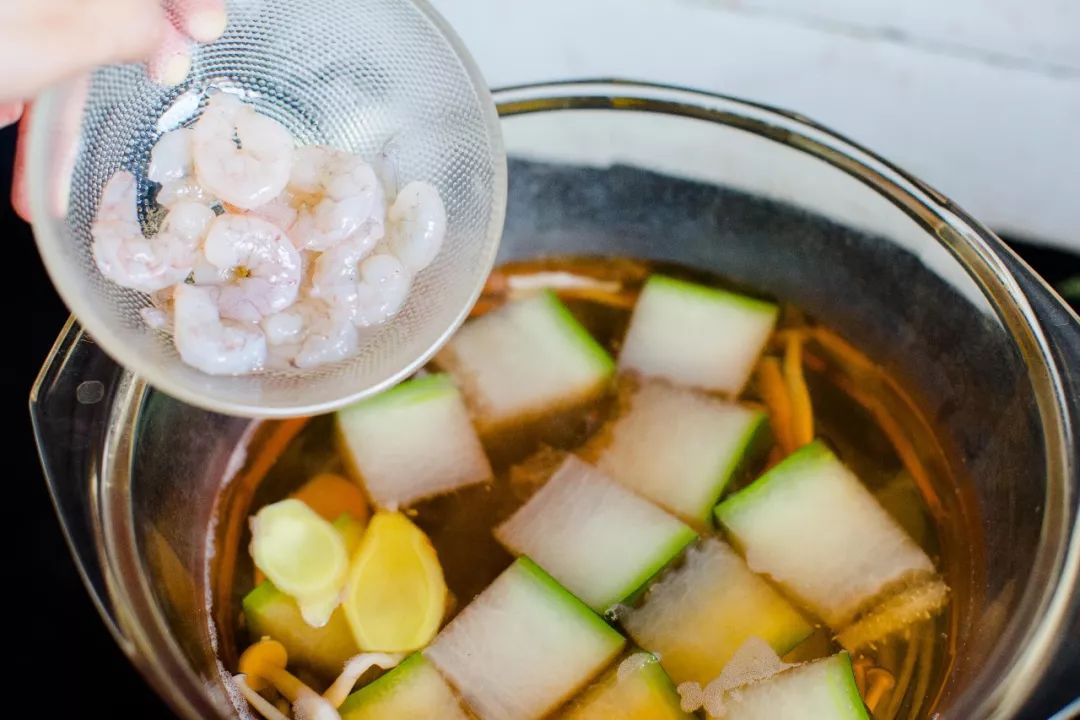 冬瓜洗净不去皮切成小块,生姜去皮切片。虾仁洗净挑去虾线后放入1瓷勺料酒静置腌制20分钟。蟹腿菇洗净备用。