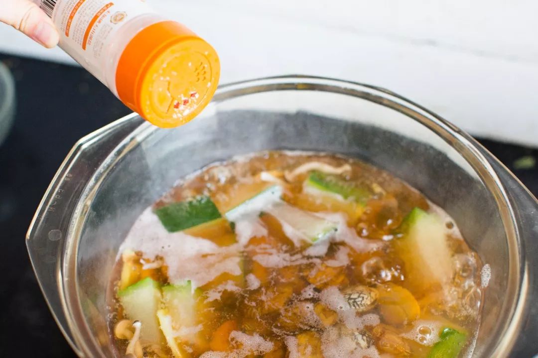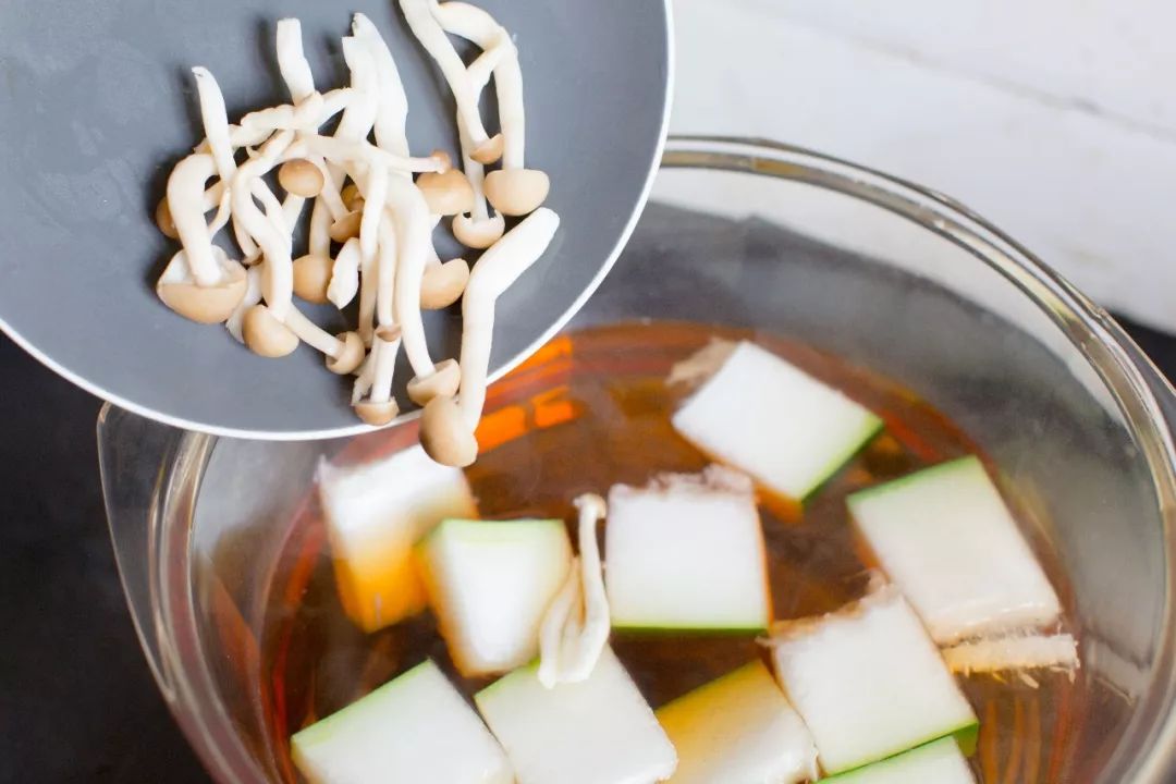 ▼ 3. 下冬瓜、菌菇:锅内先下入冬瓜和蟹腿菇。