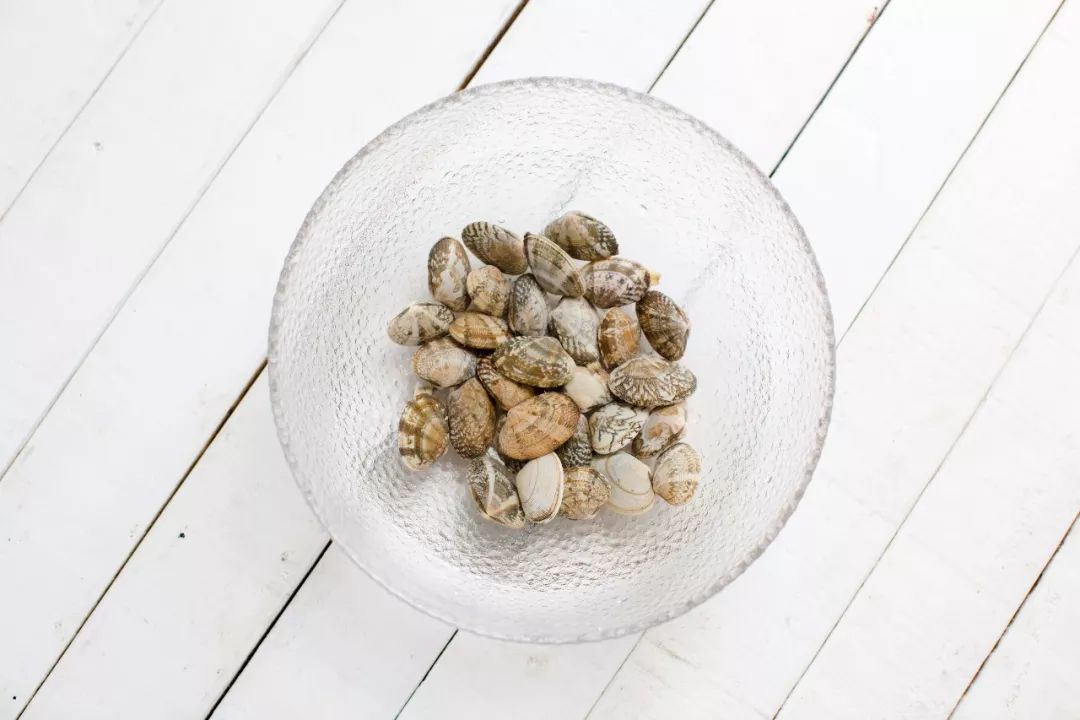 ▼ 1. 处理食材:蛤蜊洗净,提前半个小时放入50度的温水中让其吐沙。