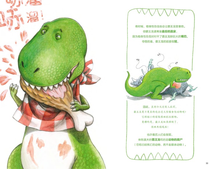 在《恐龙天下》中,讲到恐龙为什么灭绝时,图中的恐龙正看着一份报纸,报上的头条新闻是《恐龙完蛋了?》