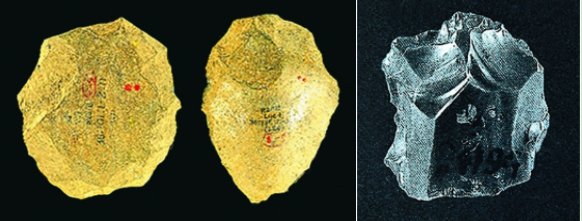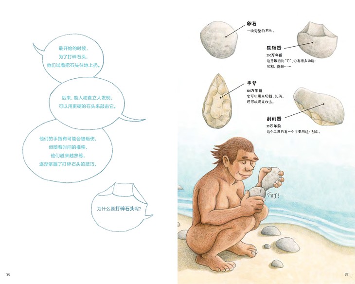 后来,他们发现可以用更硬的石头把它敲碎,于是就这样做出了一些原始的武器:砍砸器、手斧、刮削器——