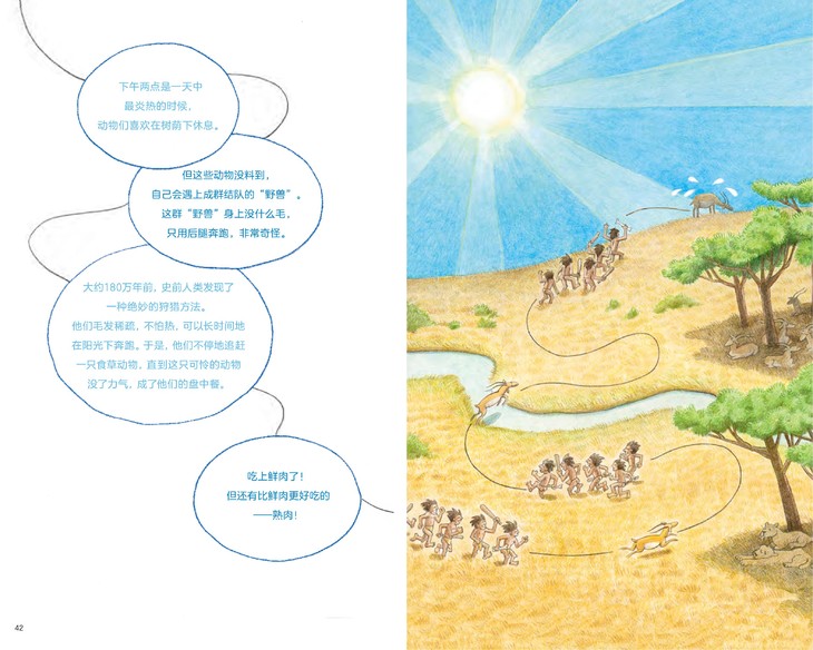 《古猿冒险》里的这一页运用简洁的推论,告诉我们猿人的毛发越来越短,是为了应对非洲大草原酷热的天气,展现了生物进化中的因果关系。