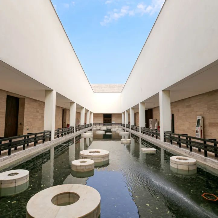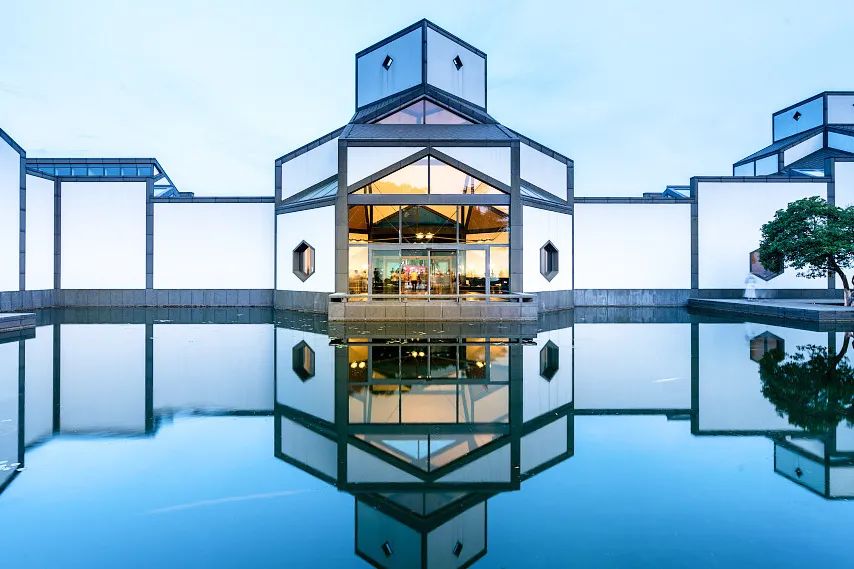 在这里,我们看到传统和现代的结合,叠⼭理⽔中藏有曲桥凉亭的园林。设计者贝⾀铭曾说:这是光与影设计出来的。在展馆内部,人们感受到和外⾯的风景融为⼀体,达到天⼈合⼀,⼈与⾃然和谐共处的境界。