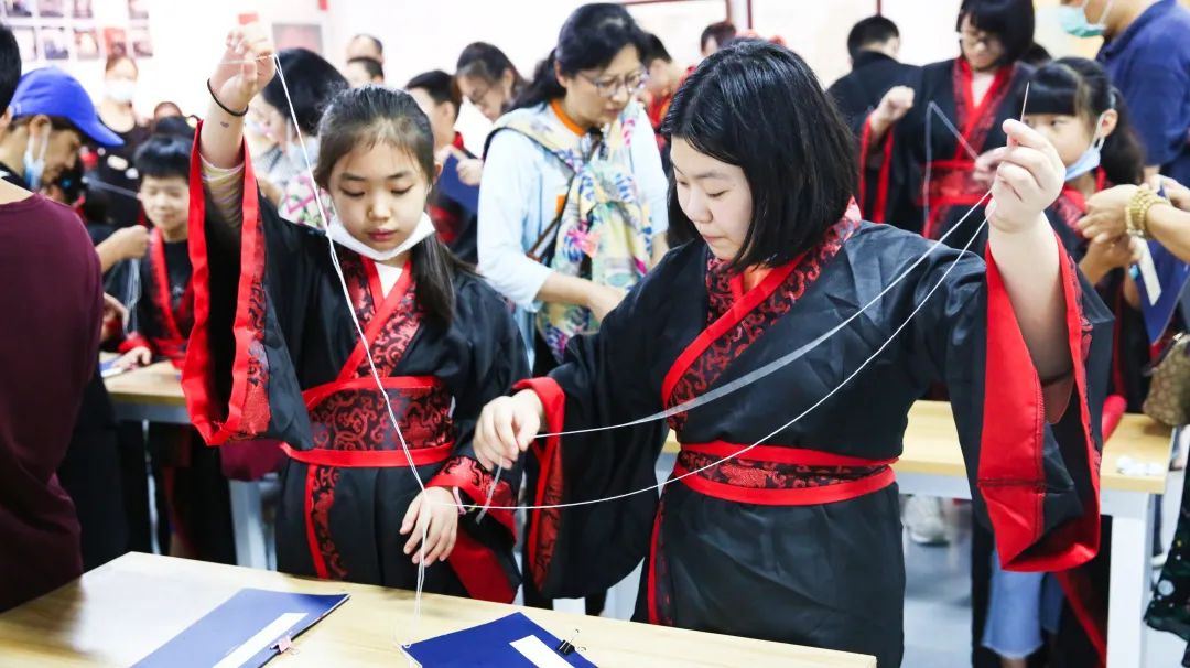 线装书是中国古代纸本书的技艺巅峰。孩⼦们会和我们的导师⼀起,依次完成“理料”“配页”“齐栏”“打眼”“穿针”“包⻆”“装订”等步骤,完整地体验线装书的制作,感受墨⾹记忆,探听历史的声⾳。