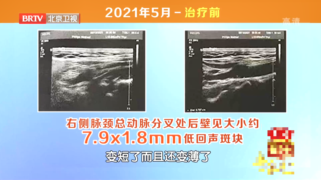 60岁的李女士在不到半年的时间里,颈动脉硬化斑块竟然能缩小,由7.9x1.8mm减小到6.4x1.6mm。