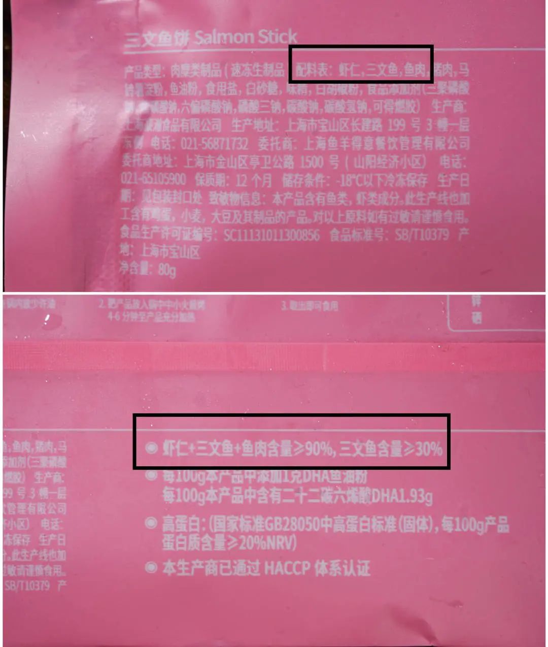 暖暖推荐的这款鲜虾三文鱼饼无虾味粉无鱼糜,配料表第①位是虾仁,第②位是三文鱼,老少皆宜。