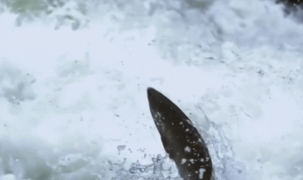 而在洄游期间,它们往往会遇到很多高落差的水流,如瀑布堤坝,这时它们会跳过去,有时相当于一个人跳过了4层楼的高度。