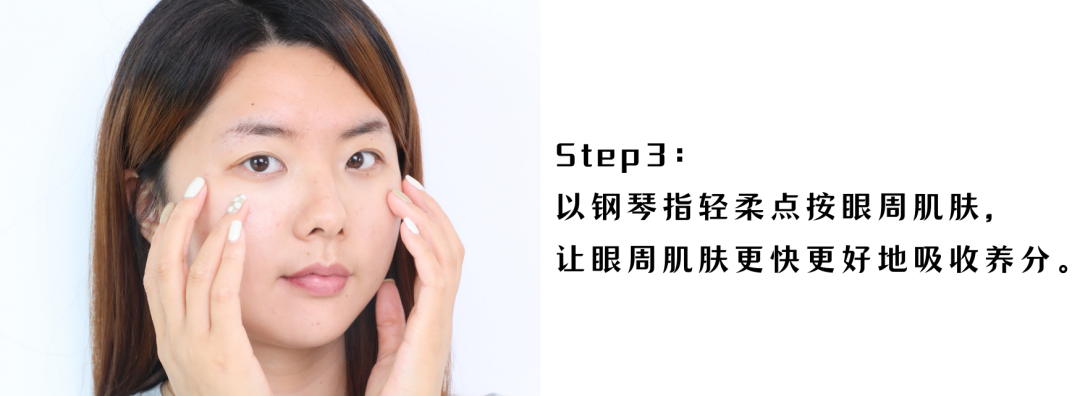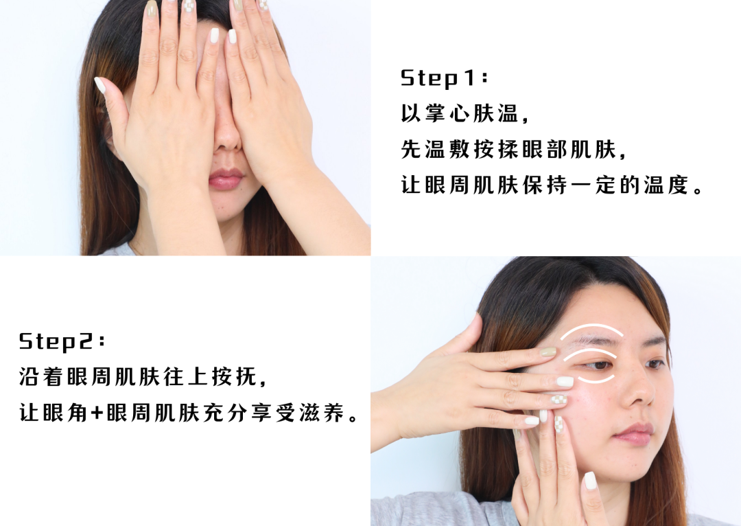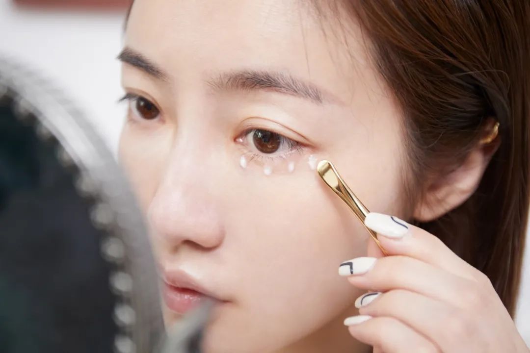 在使用手法上,小编日常的方法是先取适量点涂在眼周,再从眼头至太阳穴,八字打圈式慢压涂开。