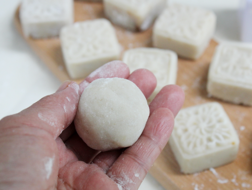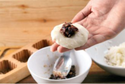 7、把球放在手心轻轻揉至方便放入磨具的长圆形,再在上面粘点熟糯米面,以防在磨具中粘住。