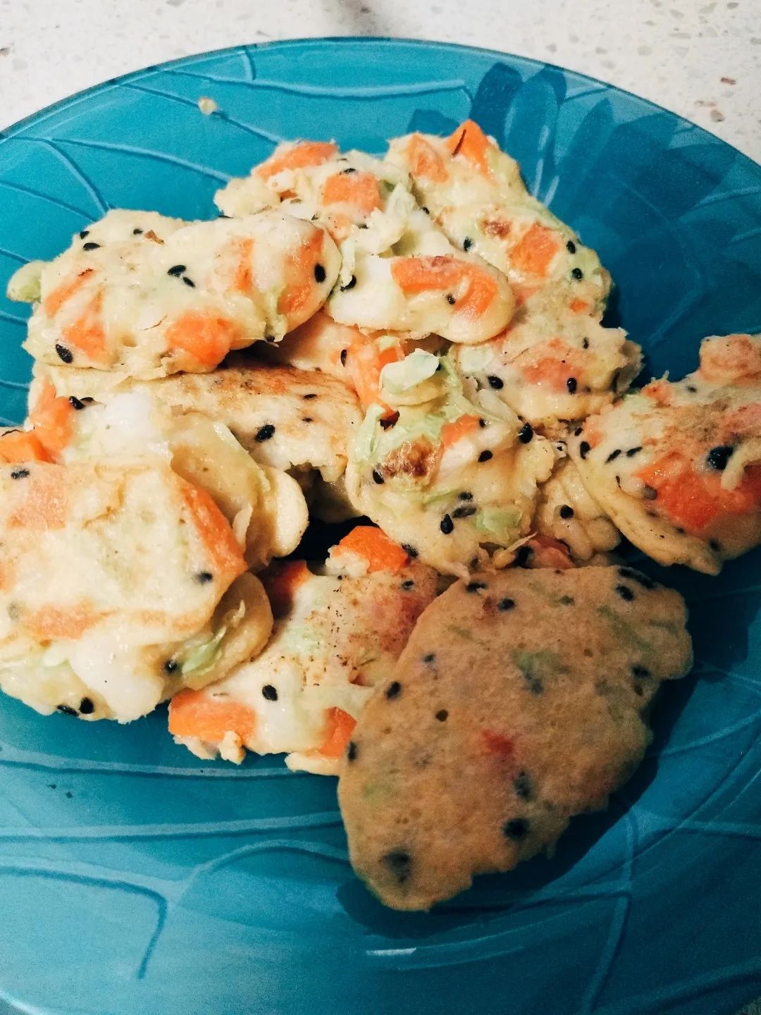 山药、全麦面粉、鸡蛋两个、蔬菜碎、黑芝麻。