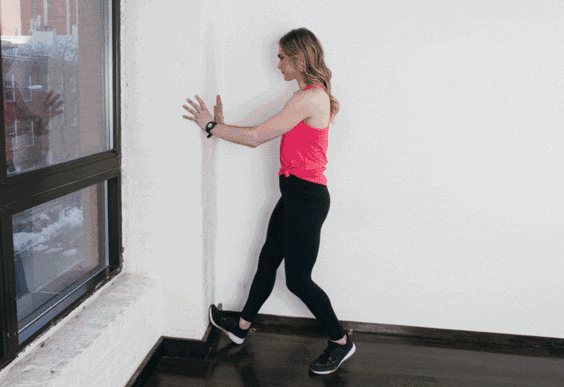 第三个动作是腘绳肌的拉伸,伸出你目标的下肢,勾住脚背挺直上身,也可以借助墙壁。髋关节作为你的旋转轴,身体往前倾,倾的过程中负重的那条腿膝关节可以稍微弯曲一点。在这个时候把你的重心,从后面那条腿往前移,把重心压到前面那条腿上,你会发现腿后面的肌肉一下子就绷紧了,后面肌肉绷紧的前提下,维持30秒,然后可以回到原位休息5-10秒钟,接着进行下一轮。