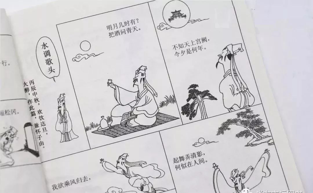 《漫画版宋词》也是如此。这首《水歌掉头》,把每一处作者的内心都画了出来。尤其那个“我欲乘风归去”这个地方,你看苏轼长袖一挥,多么优雅的“范”。这一个地方,就是当时作者内心的反衬。