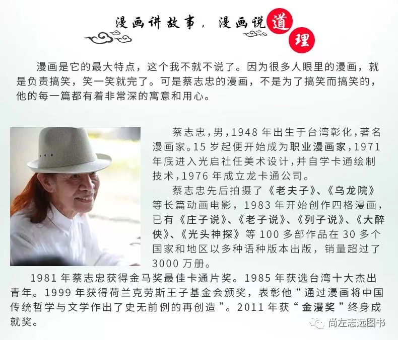 寥寥几笔,看透人生;幽默背后,尽是世间智慧。有人说,看蔡志忠的漫画,让人豁达、敞亮。那书,早已超越了年龄界限,从小到老,一生境遇不同,观感完全不同。