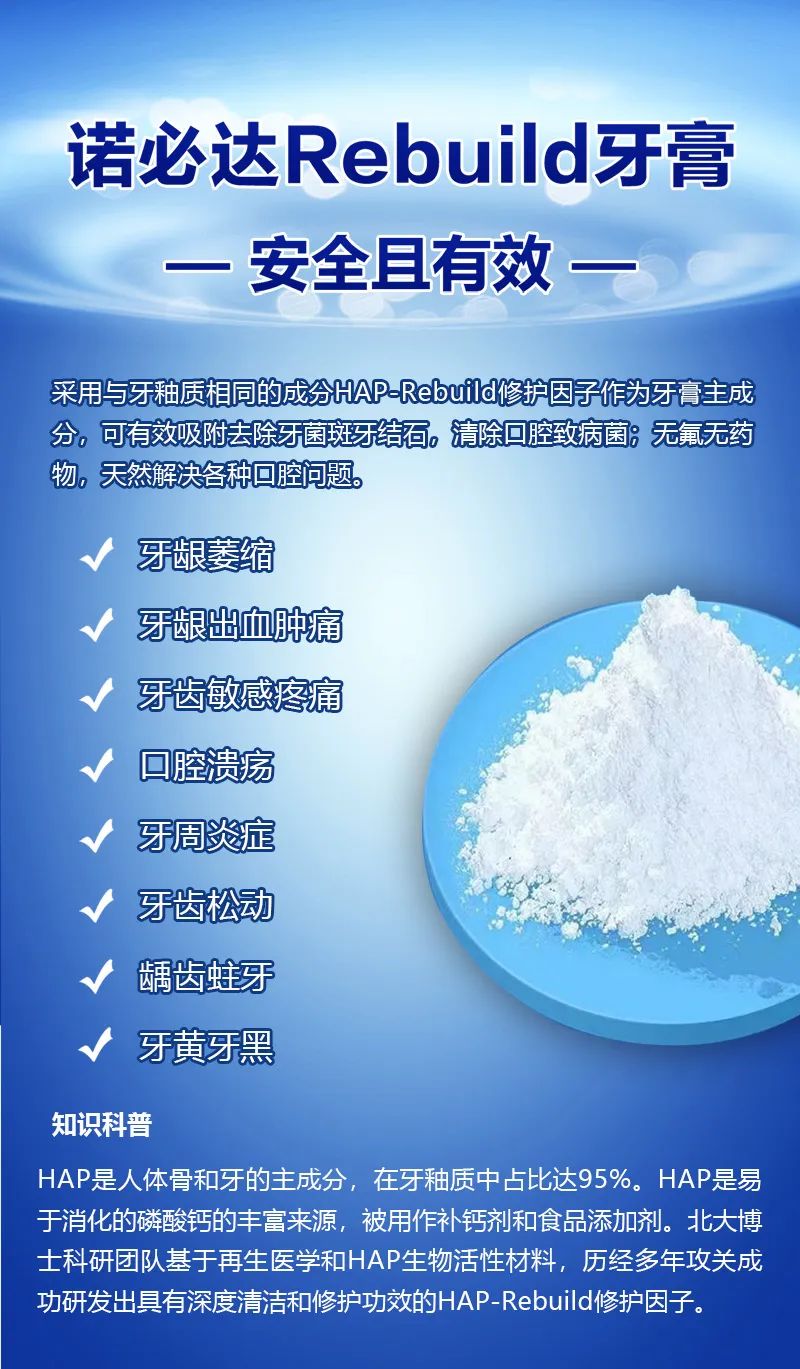 根据口腔问题的机理和国人口腔问题的特点,北大博士科研团队历经多年攻关成功研发出HAP-Rebuild技术和诺必达Rebuild新一代牙釉质修护牙膏,能够有效清除牙菌斑牙结石,修护牙釉质损伤,从根源上抑制口腔问题的成因,牙菌斑牙结石和牙釉质损伤导致的牙龈出血肿痛、牙齿敏感疼痛、牙齿松动、牙周炎症、牙黑牙黄、口臭等常见口腔问题,自然得到有效缓解和改善。