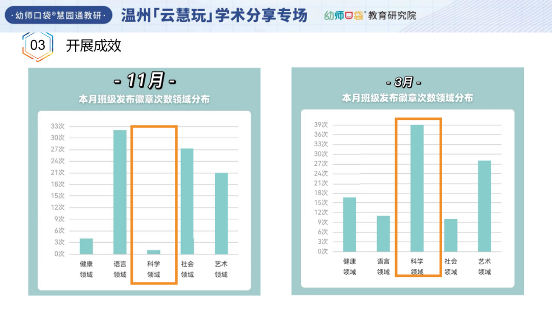 而在新学期3月的时候,老师再次查看了【班级月报】,科学领域的相关指数有所提升。教师们学会应用数据来检验教育成效。