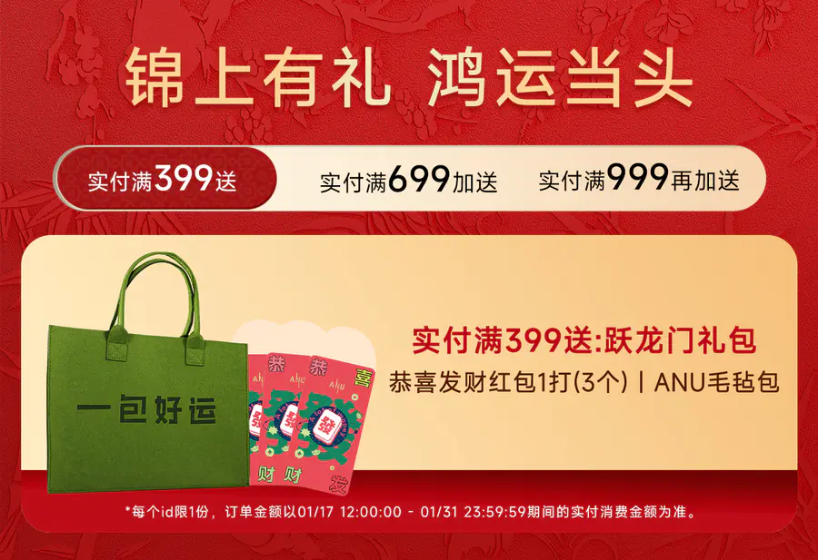 实付满399送:跃龙门礼包: 恭喜发财红包1打 (3个) +ANU毛包