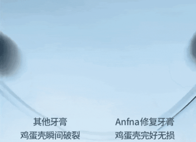 浸泡数个小时后,让两颗鸡蛋进行碰撞,涂抹其它牙膏的蛋壳瞬间破裂,涂抹小金管牙膏的蛋壳完好无损!